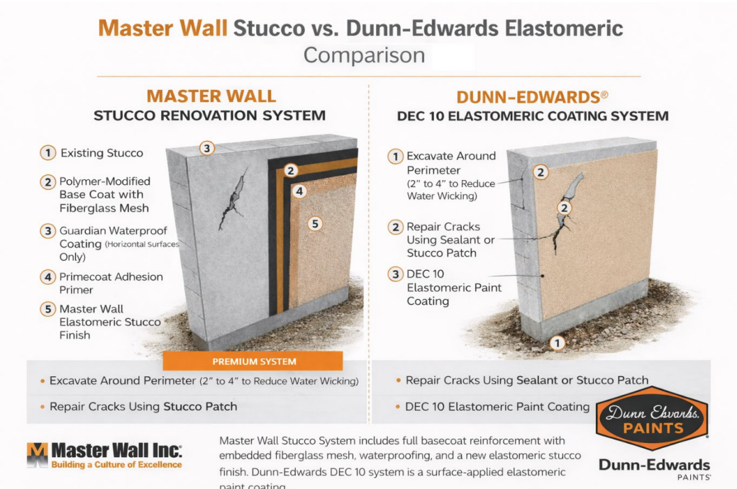 The MasterWall Stucco Renovation System is a manufacturer-approved stucco restoration system installed over existing stucco to extend service life when conditions allow.